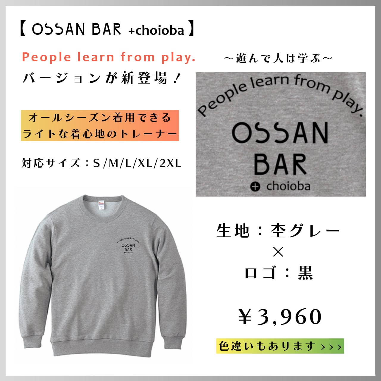 定番のOSSAN BARロゴスウェットに”Peple learn from play.”の文字入りバージョンが登場★