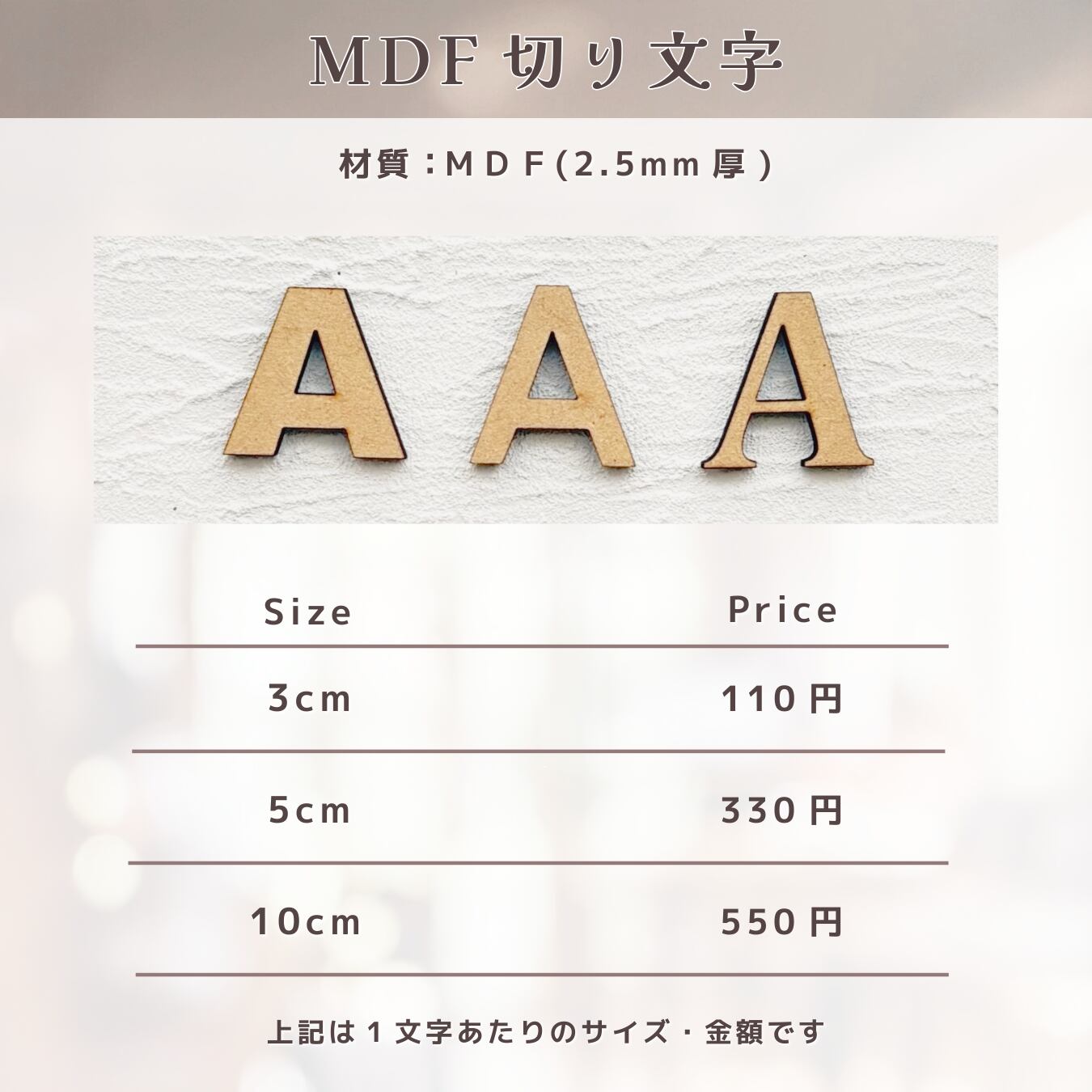 商品名:10cmサイズ/2.5mm厚 【MDF切り文字】